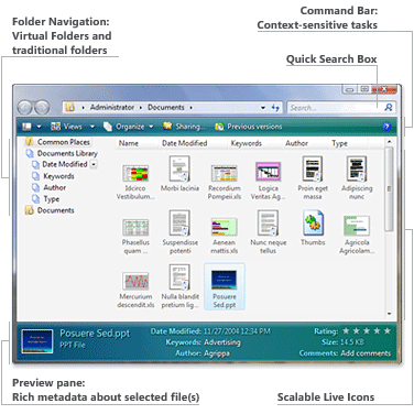Key elements of the Explorers in Windows Vista are designed to help you get to the information you need, when you need it. Quick Search is always available to help you find files instantly. The navigation pane contains the new Search Folders found in Windows Vista, as well as traditional folders that you have created on your computer. Command Bars display only the tasks that are most appropriate for the files being displayed. With new Live Icons (scalable thumbnails) used throughout Windows Vista, you can see the first page of documents, the actual image of a photo, or the album art for individual songs in your music collection, making it easier to find exactly what you are looking for.